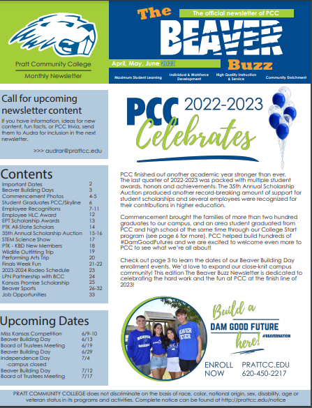 The Beaver Buzz is a monthly publication with all the latest news, student, employee and program highlights on the Pratt Community College in Pratt, Kansas.