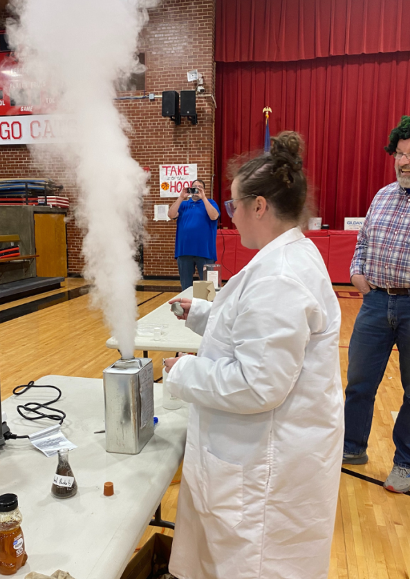 Pratt Community College science club students put on an exciting science show for 4th-6th graders with big reactions.
